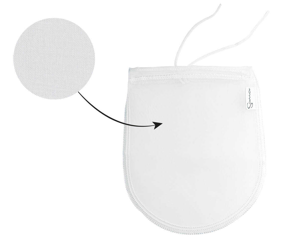 Fabriqué à partir de nylon de qualité alimentaire et sans BPA, le sac de lait de noix Sana est un moyen simple et rapide de préparer du lait de noix très onctueux à la maison. Faites simplement tremper les noix dans l'eau pendant la nuit pour les ramollir, puis mélangez les noix et l'eau dans un mélangeur ou un robot culinaire. Versez le mélange obtenu dans le sac de lait de noix, attachez les cordons et pressez le lait de noix. La taille des pores de 200 microns permet une filtration ultra fine sans nécessiter de pression excessive.