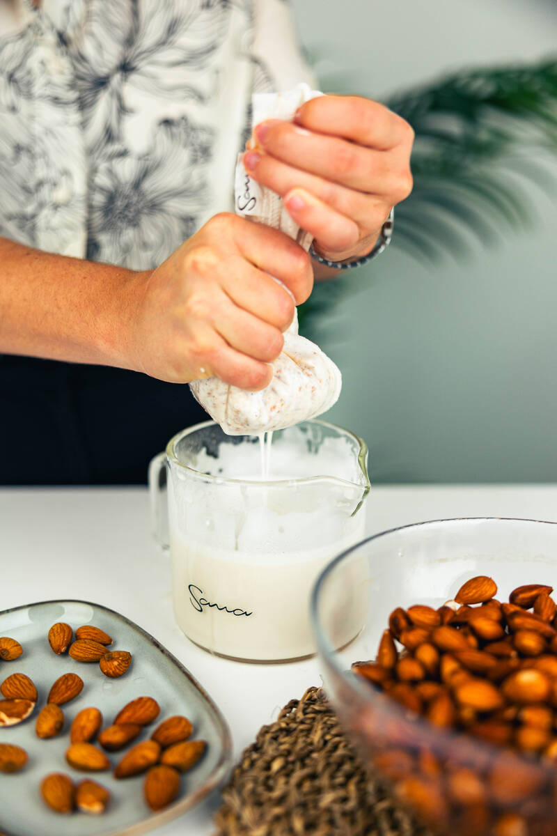 Un sac de lait de noix est le meilleur moyen d’obtenir la meilleure filtration des liquides. Il est beaucoup plus facile à utiliser qu'une étamine, car il s'attache étroitement avec un cordon de serrage, permettant un pétrissage facile pour extraire le plus de liquide de tout ce qui doit être filtré. C'est également un bon complément à un presse-agrumes horizontal, car les noix ramollies peuvent être homogénéisées dans un presse-agrumes horizontal, puis mélangées à de l'eau pour obtenir du lait d'amande pressé à froid.